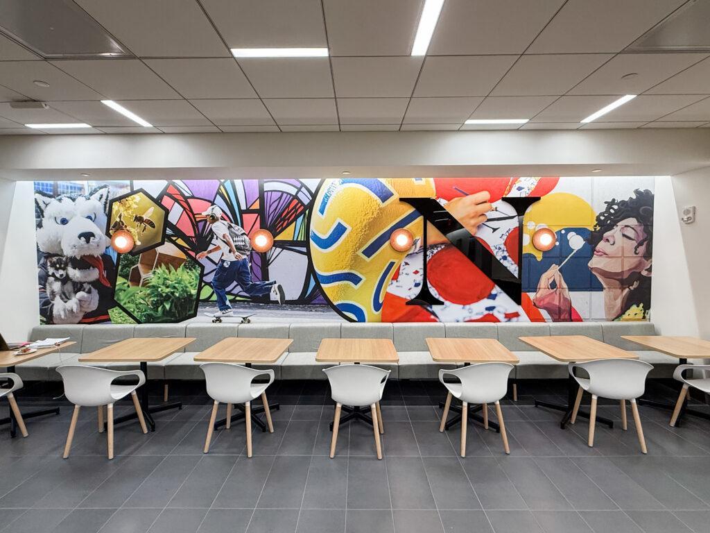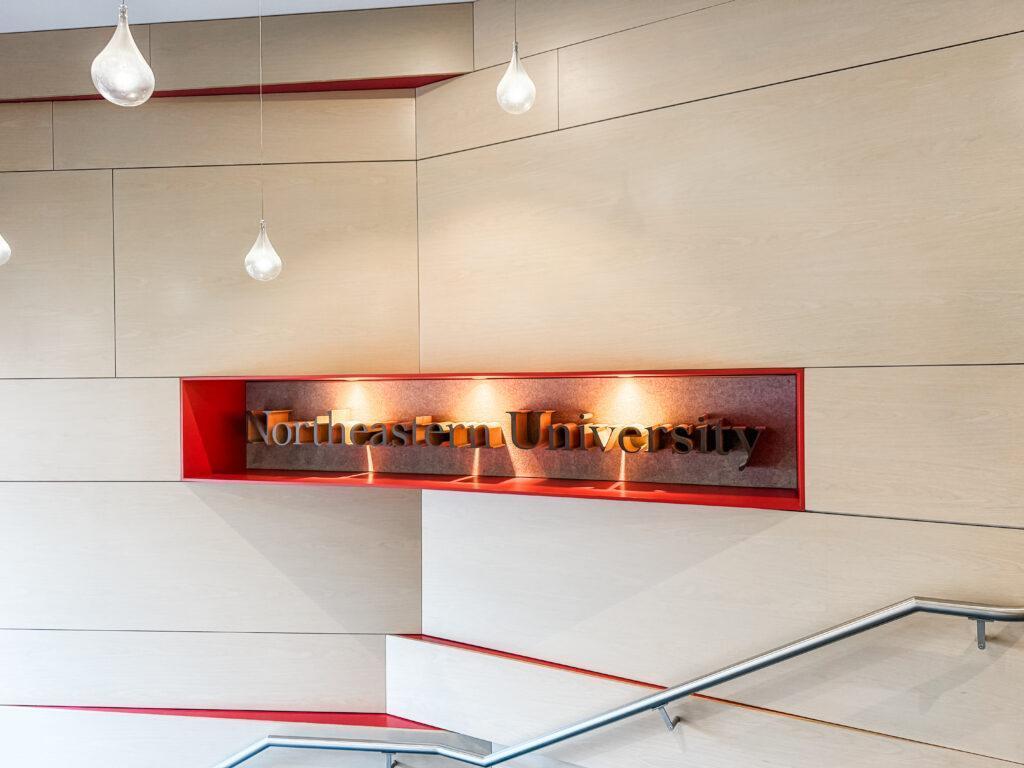 Use brand photography, including a mix of straight shots and curated imagery—with intentional crops, immersive angles, and high color saturation—to bring a space to life. You can select images from Northeastern’s Digital Image Repository and format them according to the space requirements. Executions can include a range of creative options, including simple framed series and large-format, floor-to-ceiling installations.